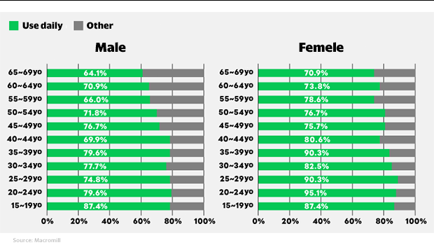 超過 60% 的所有年齡層使用者 (不分性別) 表示每天都用LINE。這種情況對20-24歲,25-29歲和35-39歲的女性尤其明顯,她們當中超過90%的用戶表示每天都會使用LINE。